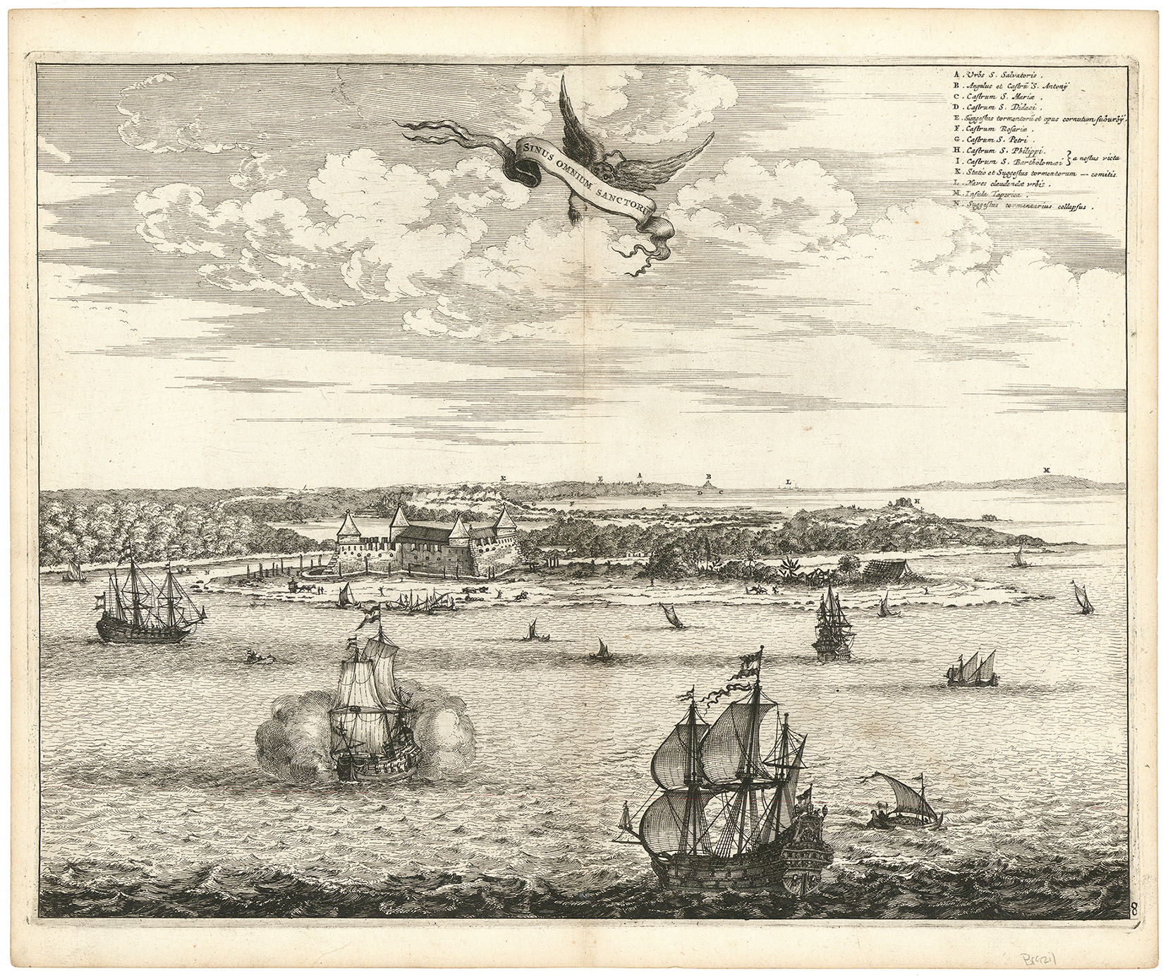 DESCRIPTION: From Montanus' "De Nieuwe en Onbekende Weereld: of Beschryving van America". This view shows the Bay of All Saints in Brazil. Known as Sao Salvador, or Bahia, the town was founded by the Portuguese in 1549. It flourished with the development of the sugar plantations and became an important political and economic center in colonial Brazil.