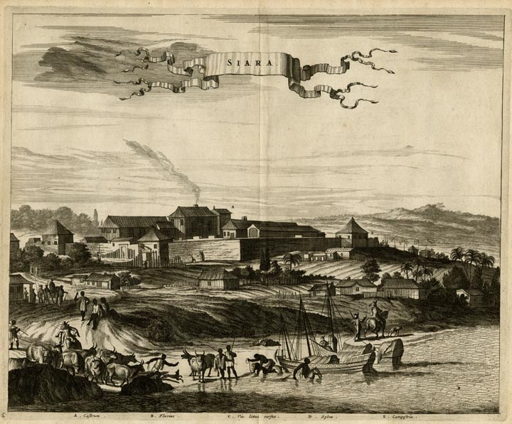 DESCRIPTION: From Montanus' "De Nieuwe en Onbekende Weereld: of Beschryving van America". A finely engraved view of a fortified town in the state of Ceara, Brazil. Locals herd cattle and horses along the waterside and load boats with trade goods. The title is encased in a beautiful ribbon banner at the top.