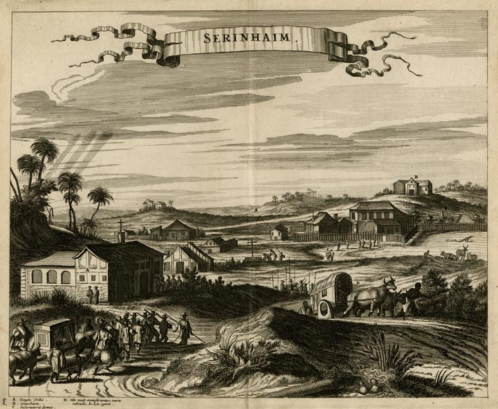 DESCRIPTION: From Montanus' "De Nieuwe en Onbekende Weereld: of Beschryving van America". A fascinating view of a fort in Serinhaim, Brazil. A procession of Portuguese or Dutch soldiers advances along the road carrying a litter. To the left is a simple church with a group of missionaries standing outside. The title is enclosed in large ribbon banner. A numbered key appears below.