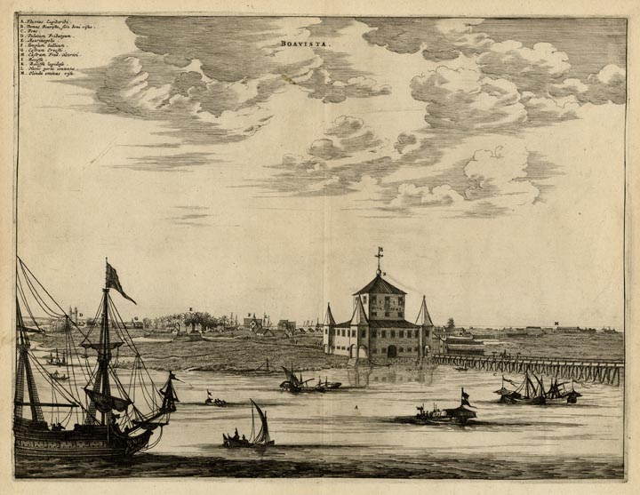 DESCRIPTION: From Montanus' "De Nieuwe en Onbekende Weereld: of Beschryving van America". This view depicts Boavista, a banqueting house, built by Nassau along the Capivaribi River in Brazil. Nassau built two bridges that connected Antonio Vas Island to the mainland. The first bridge spanned the Biberibi River between Recife and Antonio Vas, and the second, which is pictured in this image, crossed the Capivaribi River to the mainland.