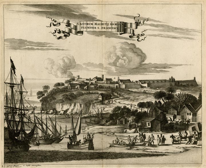 DESCRIPTION: From Montanus' "De Nieuwe en Onbekende Weereld: of Beschryving van America". This impressive view depicts Fort Maurice, which controlled the ferry on the Rio Francisco in Brazil. It was built on a steep hill overlooking the river and equipped with five bulwarks. Founded in 1637 with the arrival of Nassau’s expedition, the fort housed over 541 men.