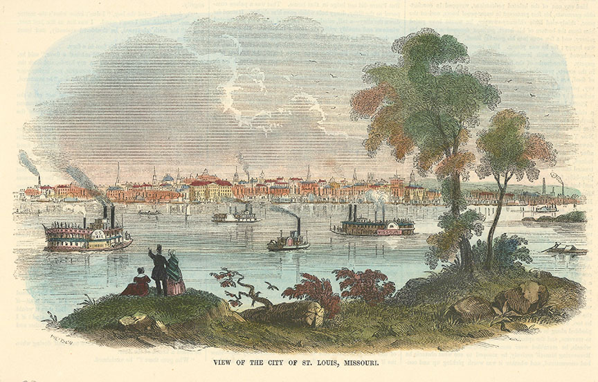 DESCRIPTION: A 19th-century perspective of the city from across the Mississippi, captured as a wood engraving and colorized to highlight the details. Published in Gleason's Pictorial Drawing-Room Companion, Boston.