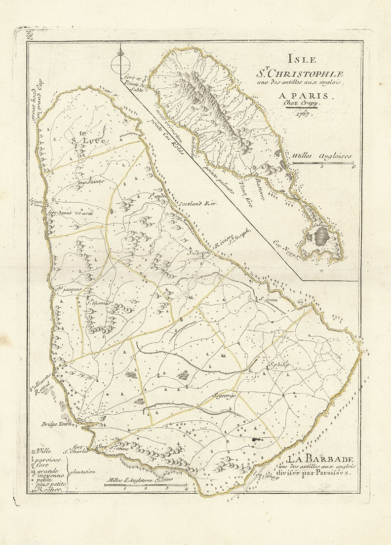 DESCRIPTION: This map, "Ile St. Christophle und des antilles aux anglois" and "La Barbade une des antilles aux Anglois divisee par Paroisses" by Jean-Baptiste Crepy were published in 1767. These maps, originally crafted around 1748 for Le Rouge's "Atlas Nouveau Portatif," were later acquired and reissued by Crepy in Paris, who added his own imprint to the newly issued editions. These prints capture the English-controlled islands of St. Christopher (St. Kitts) and Barbados during a period of intense colonial competition in the Caribbean. <br><br> Each map is meticulously detailed, showing the division of Barbados into parishes and highlighting significant geographical and man-made features of St. Christopher, offering a glimpse into the colonial landscape of the 18th century. Crepy’s enhancements make these maps not only valuable historical documents but also appealing pieces for collectors and enthusiasts of cartographic history. Their detailed portrayal of key colonial territories in the Caribbean makes them excellent additions for those interested in the era's geopolitical dynamics and colonial cartography.