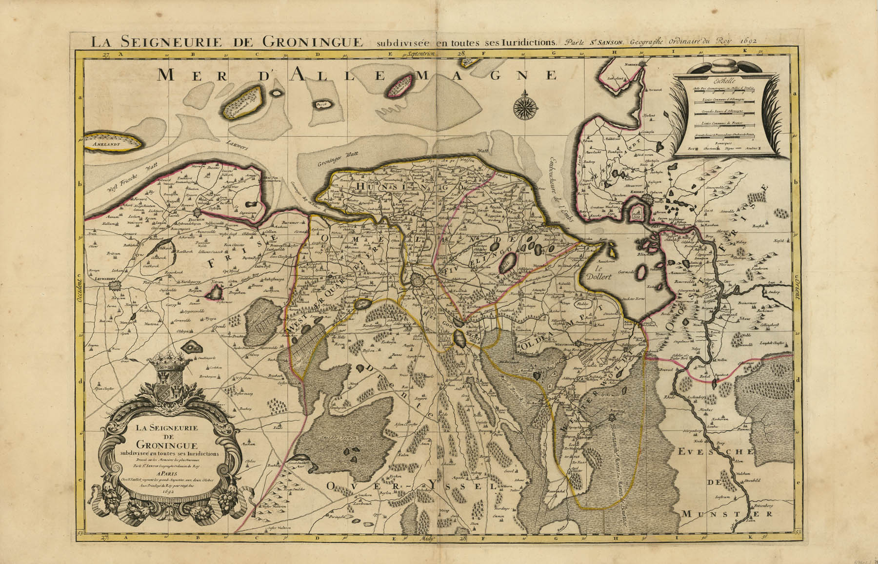 DESCRIPTION: A fine map of the province of Groningen in the northern Netherlands that appeared in Jaillot’s “Nouvelle introduction a le geographie....” Embellished with a beautifully engraved cartouche. Cartographically this map is based on the work of Nicholas Sanson.