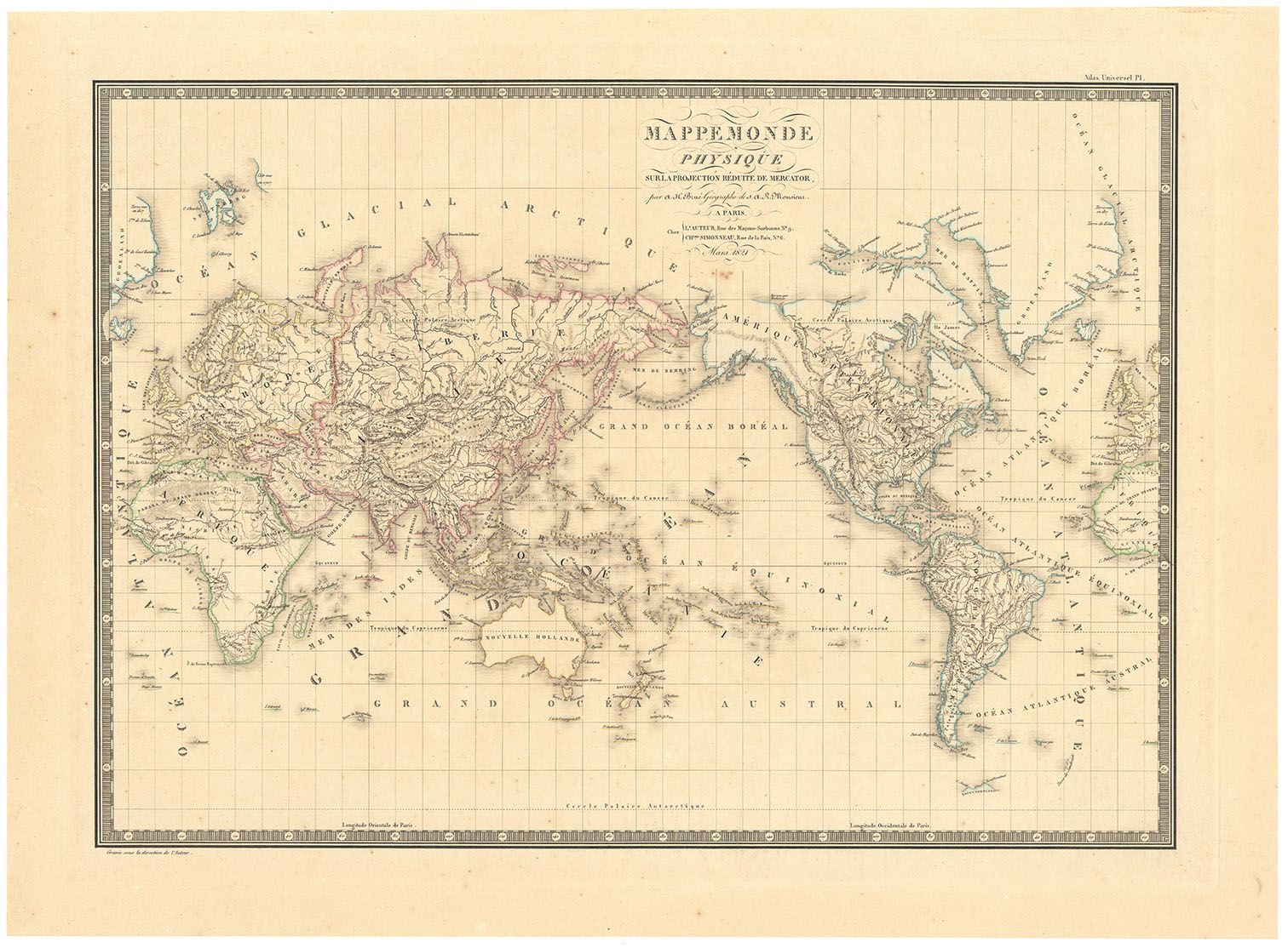 DESCRIPTION: "Mappemonde Physique sur la Projection de Mercator" is an informative map of the world, utilizing the Mercator projection and strategically centered on the Pacific Ocean. This map is distinguished by its detailed representation of topographical features across the continents and meticulous labeling of islands and archipelagos within the oceans. The Mercator projection, developed by the Flemish geographer Gerardus Mercator in 1569, was revolutionary for its ability to represent lines of constant course, known as rhumb lines, as straight segments that conserve the angles with the meridians. This characteristic made the projection immensely valuable for navigation. The map's focus on the Pacific highlights the increased exploration and naval activity in this region during the period, making it not only a tool for navigation but also a reflection of the geopolitical interests of the era.