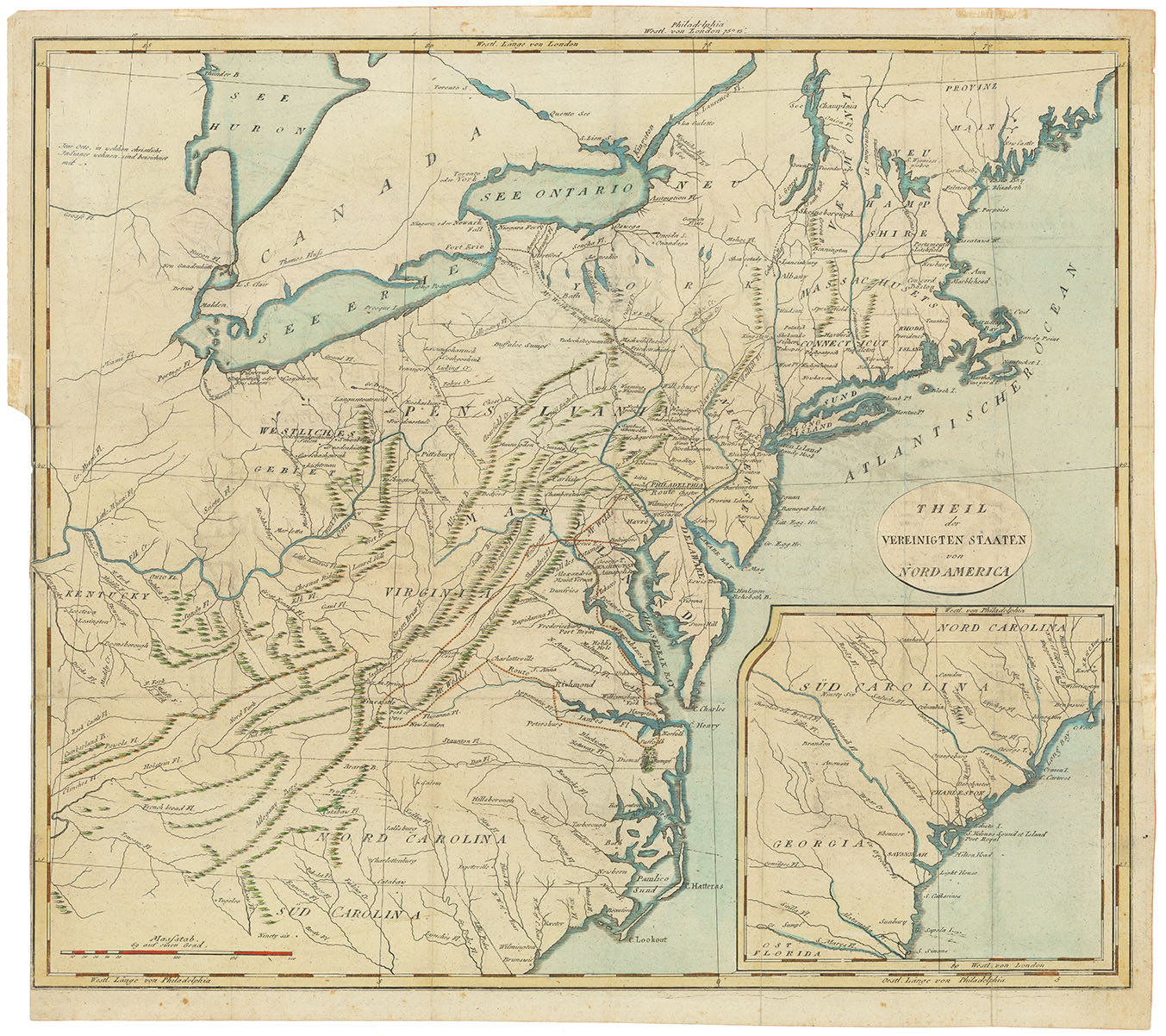 DESCRIPTION: This finely detailed 1800 German map of the eastern United States was published in Reisen durch die Staaten von Nordamerika, the German edition of Isaac Weld’s celebrated travel narrative. Adapted closely from John Stockdale’s 1798 map, it depicts the region from the Province of Maine to North Carolina, with a large inset of Georgia and South Carolina. Handcolored and rich in early American geography, the map notes key settlements, developing roadways, and frontier areas such as Kentucky and the Western Territory. Weld’s exploratory route is marked, and small icons identify the villages of “Christian Indians.” As one of the earliest illustrated amateur travel accounts of North America, Weld’s work captured widespread European interest, and this map stands as a vivid visual record of the young republic’s landscape at the close of the 18th century.