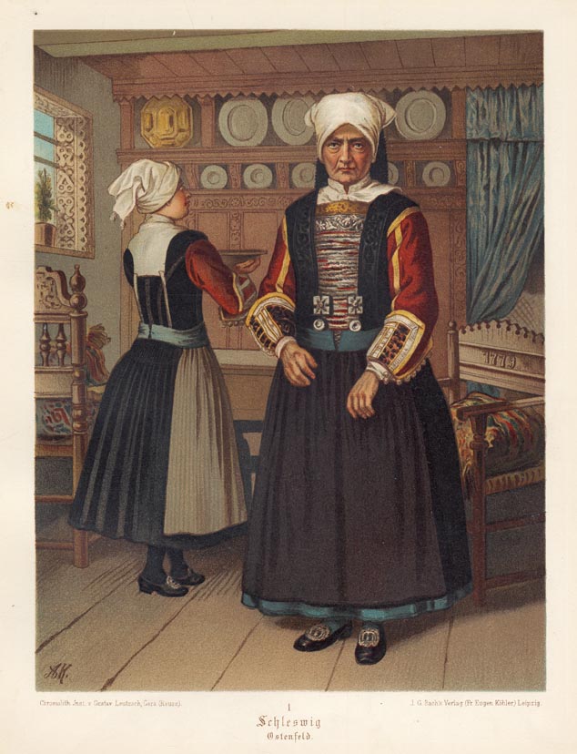 DESCRIPTION: "Deutsche Volkstrachten," published in Leipzig between 1870 and 1885, is a vibrant collection of chromolithographs showcasing the traditional costumes of various German regions and cities. Created by Chromolith Jnst. V. Gustav Leutzsch in Gera (Reuss), this work features the colorful attire of areas such as Baden, Bayern, Hannover, Hessen, Schlesien, Sachsen, Württemberg, and some Austrian regions. Based on original drawings from 1864-1870 by Albert Kretschmer (1825-1891), a painter and professor at the Königliche Hoftheater in Berlin, these illustrations capture the essence of mid-19th-century German dress, preserving the rich cultural heritage of the time.