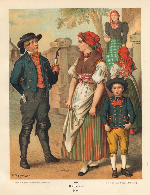 DESCRIPTION: "Deutsche Volkstrachten," published in Leipzig between 1870 and 1885, is a vibrant collection of chromolithographs showcasing the traditional costumes of various German regions and cities. Created by Chromolith Jnst. V. Gustav Leutzsch in Gera (Reuss), this work features the colorful attire of areas such as Baden, Bayern, Hannover, Hessen, Schlesien, Sachsen, Württemberg, and some Austrian regions. Based on original drawings from 1864-1870 by Albert Kretschmer (1825-1891), a painter and professor at the Königliche Hoftheater in Berlin, these illustrations capture the essence of mid-19th-century German dress, preserving the rich cultural heritage of the time.