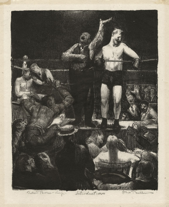 DESCRIPTION: Signed and titled in pencil. "Bellows found excitement in every aspect of the fight. Before the brutal event, the tense contender is being reassured in the corner by his manager, while the champion, the fair-haired boy of the evening, is acclaimed with enthusiastic shouts. " - The Lithographs of George Bellows, a Catalogue Raisonne by Lauris Mason