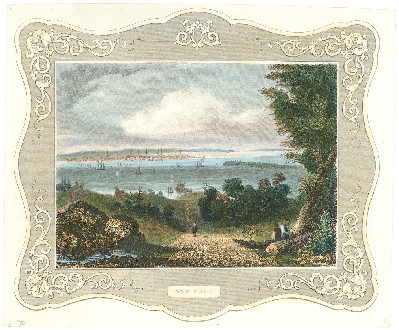 DESCRIPTION: This steel engraving presents a panoramic view of New York City from across the river, highlighting its growing skyline and bustling harbor. Set within an elaborate decorative border, the scene contrasts a quiet pastoral foreground with the energetic city's rapid mid-19th century transformation.