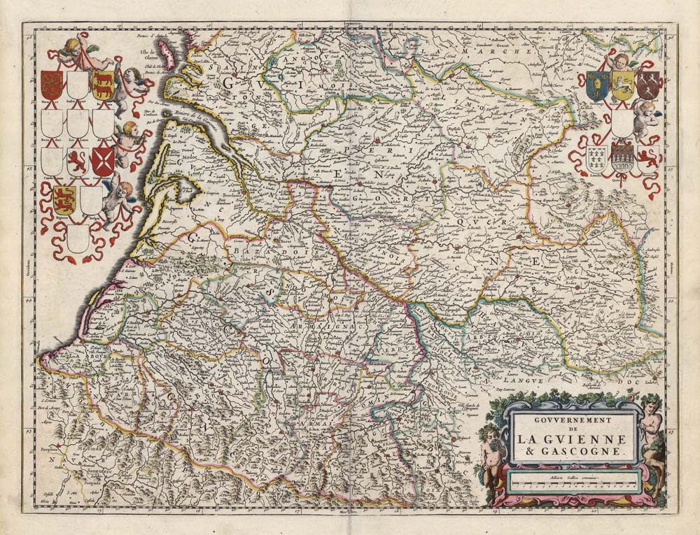 DESCRIPTION: Blaeu's detailed map of the famous wine regions of southeastern France. Embellished with a hansome title cartouche that is surrounded by two satyrs and ripe grape vines. In the upper corners are coats of arms held aloft by putti. This map was issued in Wolfgang's "Atlas Minor" which is a compilation of maps originally issued by Blaeu, de Wit, Visscher and others.