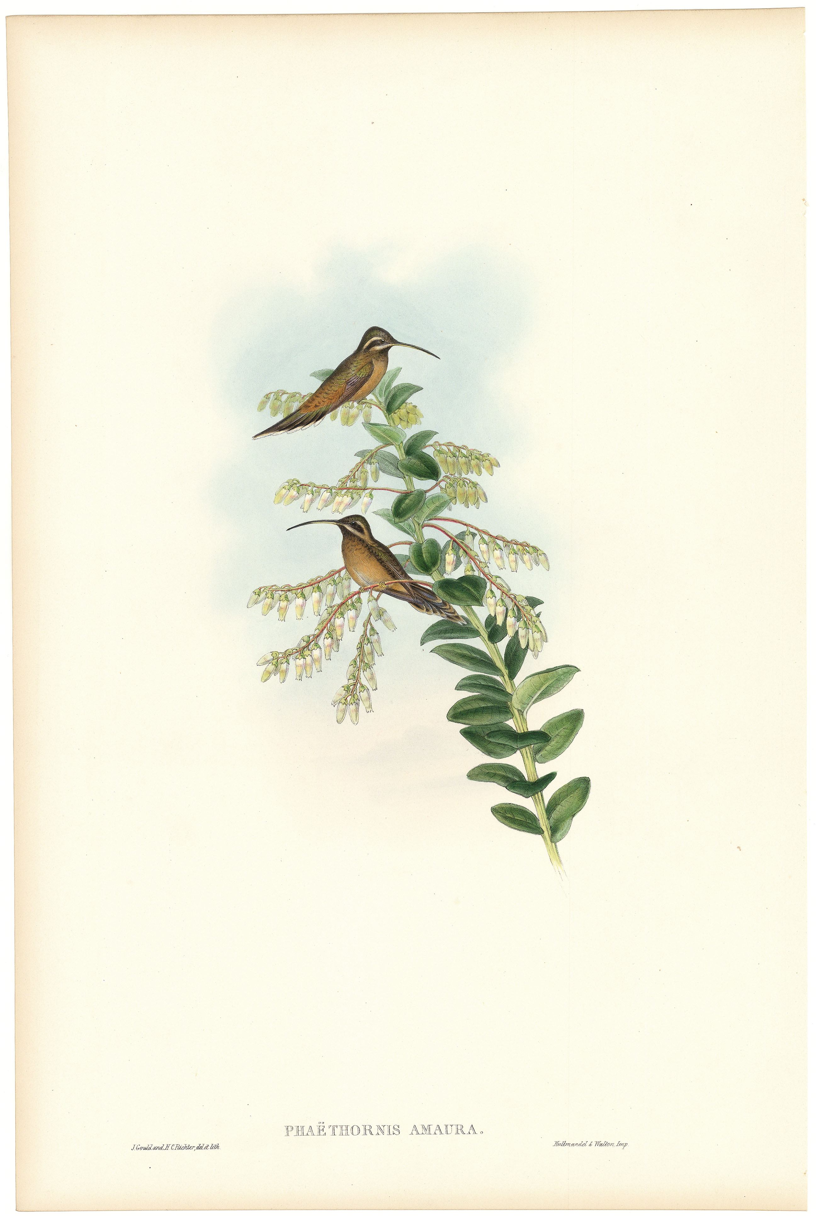 DESCRIPTION: From A Monograph of the Trochilidae, or Family of Humming-Birds, 6 vols., large folio. Published in London, 1849–1887. Printed by Hullmandel and Walter from drawings by J. Gould, H. C. Richter, and William Hart, lithographed by the artists. The Streak-throated Hermit is a slender, soft-plumed hummingbird found in the shaded forests of Central and South America. Its subdued brown and olive plumage, pale streaked throat, and gently decurved bill reflect the understated beauty of the hermit group. In Gould’s hand-colored lithograph, the bird is shown feeding among pendulous blossoms, its delicate form balanced within a composition of tropical foliage. Metallic pigments subtly enhance the sheen of its feathers, lending the print both depth and quiet vitality while preserving the natural restraint characteristic of this species. John Gould’s Monograph of the Trochilidae remains one of the most impressive artistic and scientific undertakings of the nineteenth century. Created over nearly four decades, it united Gould’s precise field observations with the exceptional craftsmanship of Henry Constantine Richter and William Hart. The Streak-throated Hermit plate reflects their shared devotion to accuracy and beauty, portraying one of nature’s most elusive hummingbirds with fidelity, elegance, and an enduring sense of life.