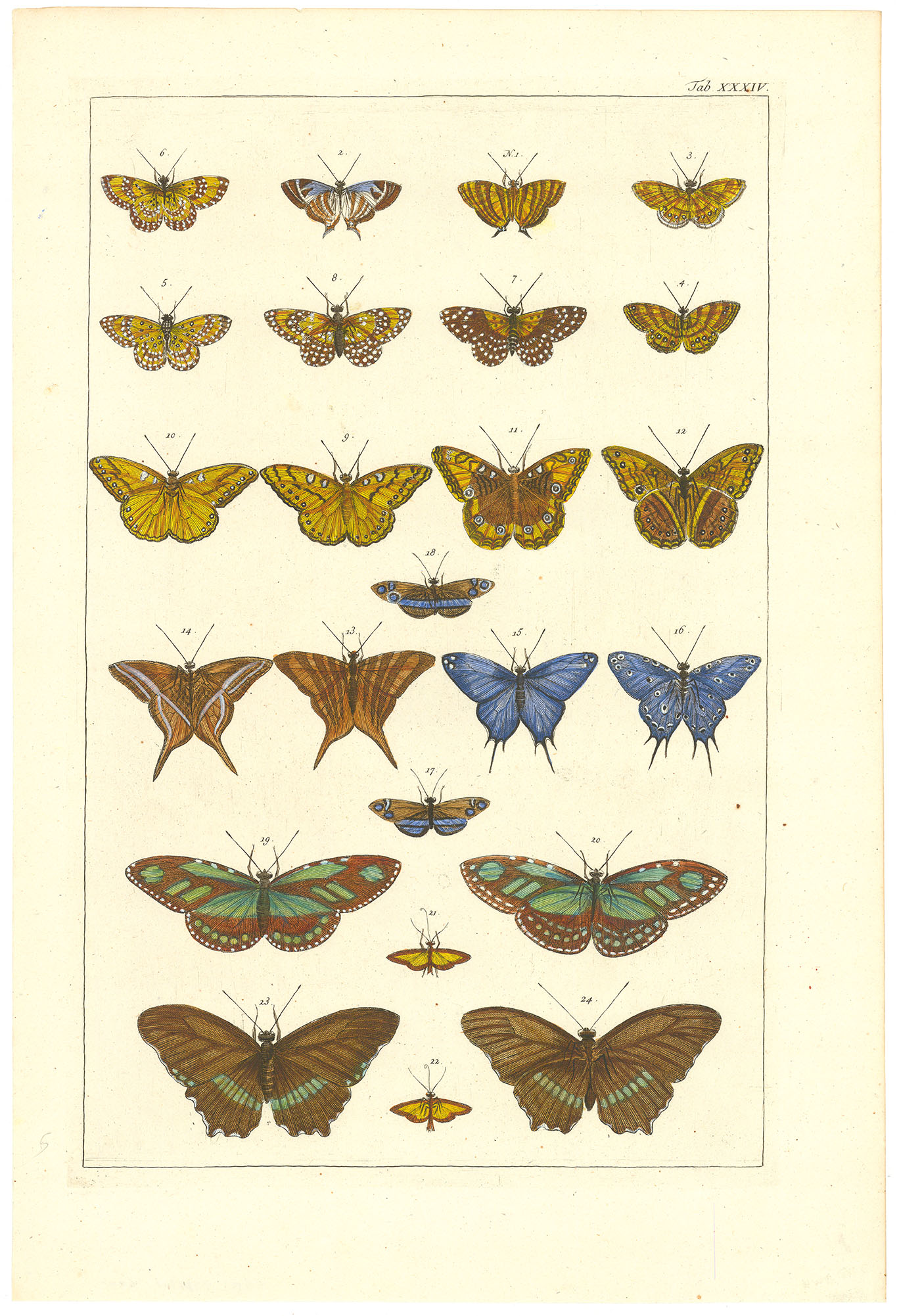 DESCRIPTION: From Locupletissimi Rerum Naturalium Thesauri Accurata Descriptio et Iconibus Artificiosissimis Expressio… Plate XXXIV depicts a variety of butterflies and moths, most of which are believed to come from the Americas. The engravings highlight a wide spectrum of forms and colors, from yellow species marked with brown bands and white spots to brilliant sky-blue butterflies with white-tipped wings, alongside richly patterned browns, greens, and russets. Together they showcase both the diversity and the beauty of American Lepidoptera as seen through Seba’s celebrated natural history.