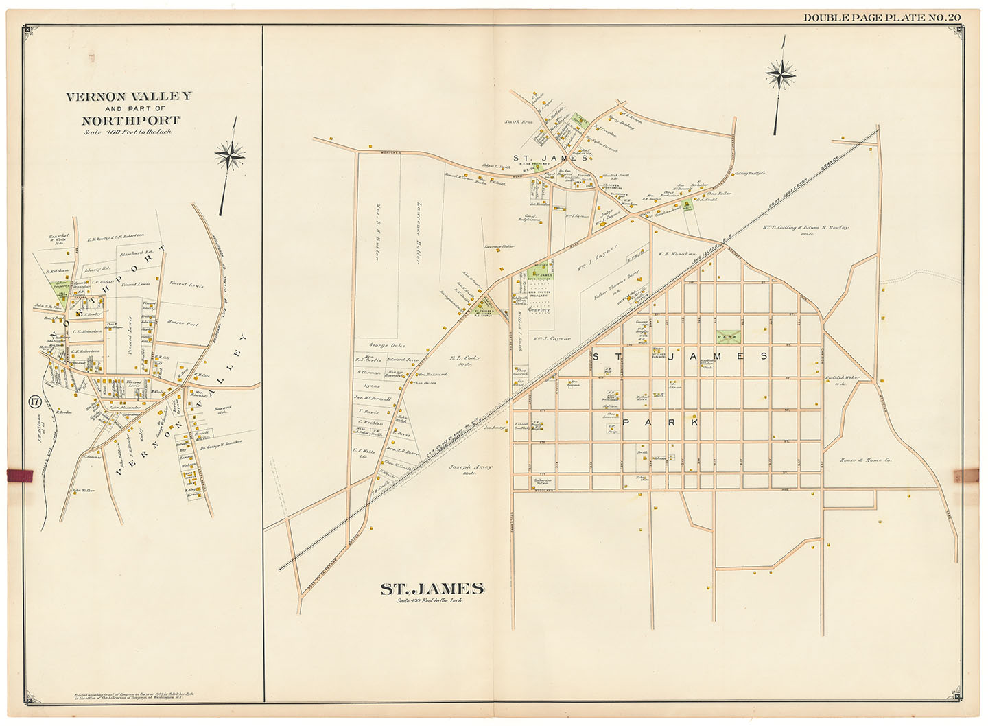 DESCRIPTION: A detailed map of the the north shore village of Vernon Valley and a small portion of Northport. And a separate large map St. James. Notes building owners, lots and structures.<br><br> This map appeared in Hyde's very scarce oversized "Atlas of Suffolk County Long Island, New York... Sound Shore.”