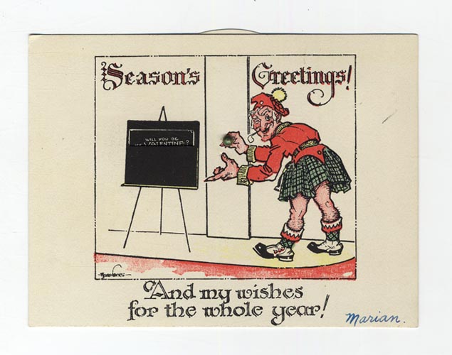 DESCRIPTION: This mechanical card features a Scotsman guesturing to a board. Spin the wheel and greeting for many of the years holidays, including Valentines Day, Fathers Day, Wedding Day, Easter, Baby Congragulations, Christmas and several more.