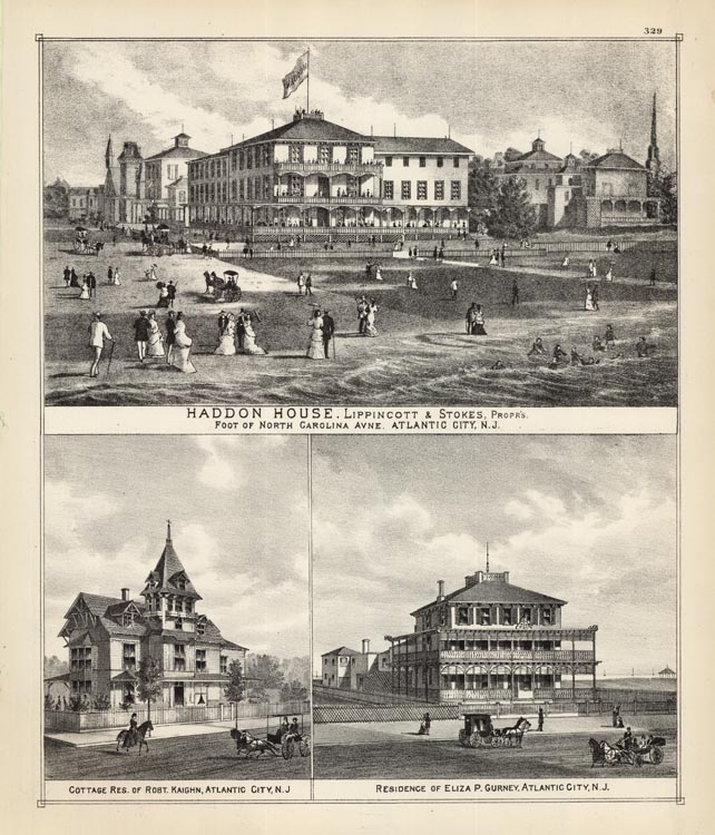 DESCRIPTION: View showing the Haddon House, collaged with Cottage Res. of Robt. Kaighn, Atlantic City, N.J. and the Residence of Eliza P. Gurney, Atlantic City, N.J. It appeared in T. F. Rose's "Historical and Biographical Atlas of the New Jersey Coast. Proposed, arranged and illustrated by T. F. Rose; Surveys by H.C. Woolman."