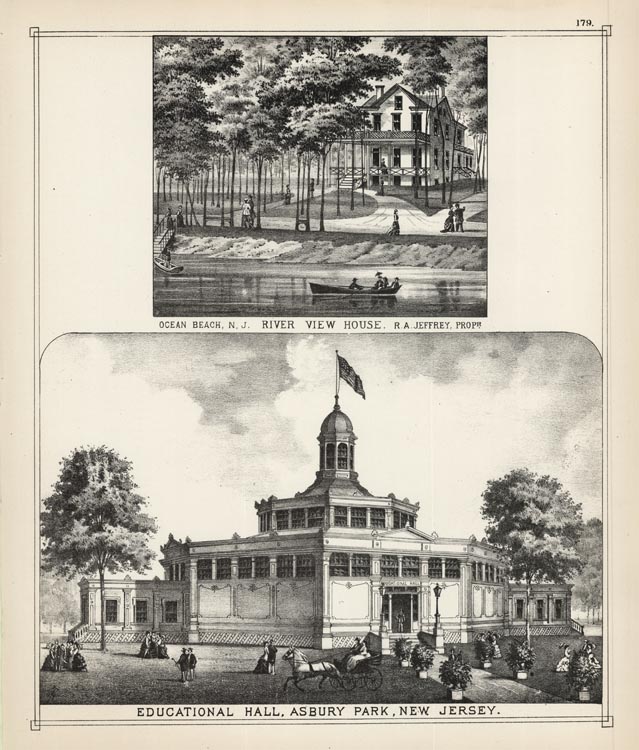DESCRIPTION: View showing the Educational Hall and the river view house. It appeared in T. F. Rose's "Historical and Biographical Atlas of the New Jersey Coast. Proposed, arranged and illustrated by T. F. Rose; Surveys by H.C. Woolman."