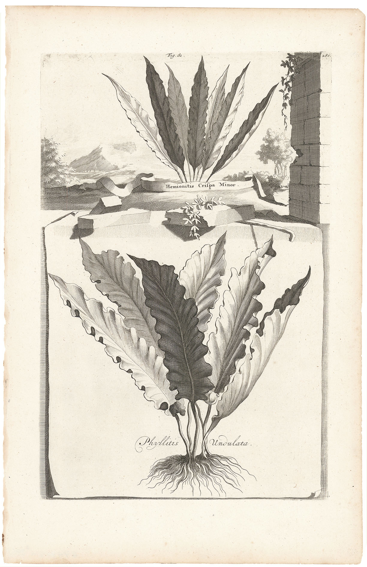 DESCRIPTION: Munting's engravings are distinguished by a unique style in which the plants are set in, or floating above, classical and idyllic landscape backgrounds. Often they are further ornamented with ribbons, plaques and architectural tablets. From "Phytographia Curiosa Exhibens Arborum, Futicum Herbarum AC Florum Icones..."