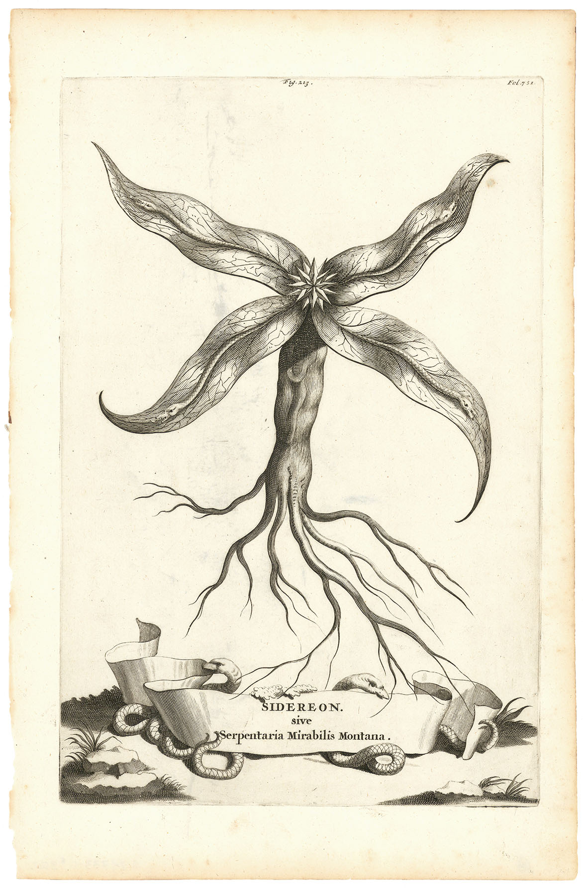DESCRIPTION: Commonly known as Mandrake, the illustration of Sidereon: sive Serpentaria Mirabilis Montana (Plate 213) hails from the 1702 edition of Abraham Munting’s Phytographia Curiosa, a work that remains one of the most stylistically eccentric entries in the history of botanical art. Munting, a Dutch physician and botanist who oversaw the botanical garden at Groningen, presented his specimens through a surreal, Baroque lens. Here, plants appear as towering giants dwarfing the tiny, idyllic landscapes of ruins, villas, and pastoral hillsides beneath and behind them. This specific plant, a member of the nightshade family famously shrouded in ancient folklore and medicinal mystery, is rendered with a heavy emphasis on its structural geometry and distinct root form, reflecting the 18th-century fascination with exotic flora that could survive the journey to European "curiosity" gardens.