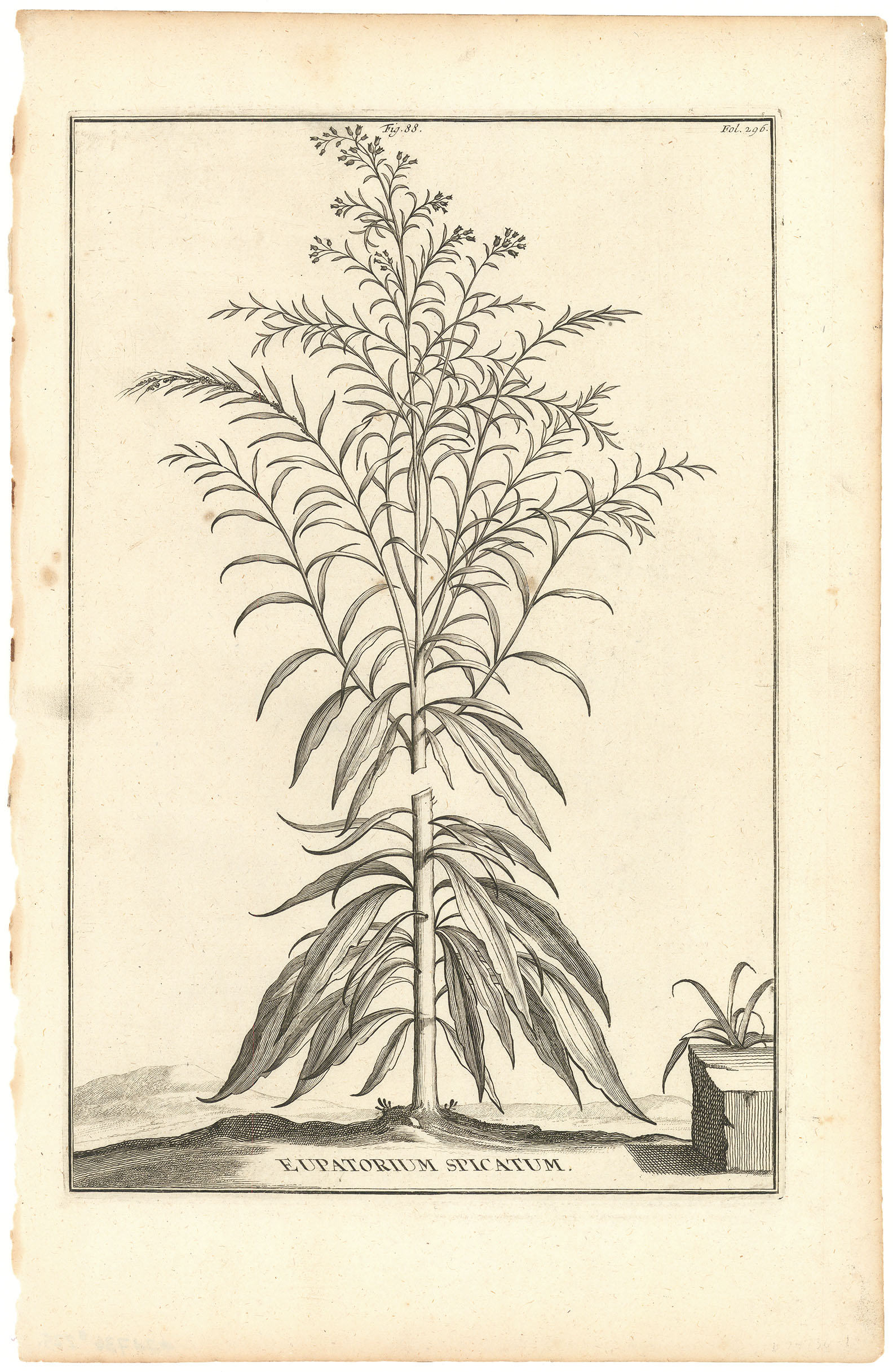 DESCRIPTION: Munting's engravings are distinguished by a unique style in which the plants are set in, or floating above, classical and idyllic landscape backgrounds. Often they are further ornamented with ribbons, plaques and architectural tablets. From "Phytographia Curiosa Exhibens Arborum, Futicum Herbarum AC Florum Icones..."