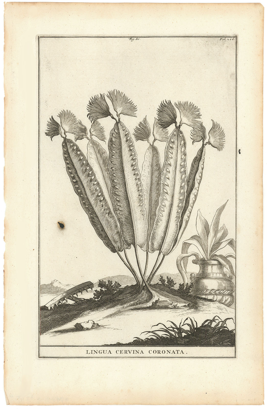 DESCRIPTION: First published in 1702, Phytographia Curiosa Exhibens Arborum, Fruticum, Herbarum ac Florum Icones... is one of the most visually imaginative botanical works of the Baroque era. The engravings by Abraham Munting are distinguished by their highly original style, where plants appear set within, or floating above, classical and idyllic landscapes. These compositions are often adorned with ornamental ribbons, inscribed tablets, and architectural elements, blending scientific observation with theatrical flourish. Munting’s work stands at the intersection of art and natural history, offering a uniquely decorative vision of botanical illustration.