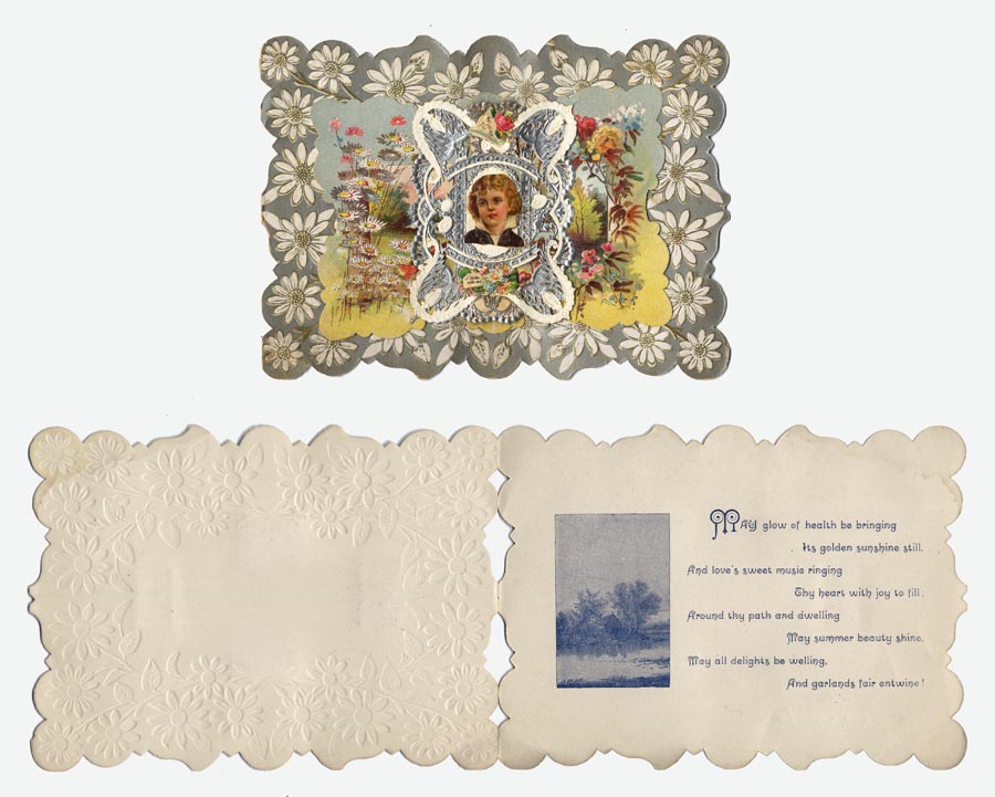 DESCRIPTION: Further poem reads "May all delights be welling, : And garlands fiar entwine!" This beautiful Valentine features a cut out of a boy surrounded by white and metallic colored paper lace. The cards underneath feature a field of wild flowers and an array of dasies.