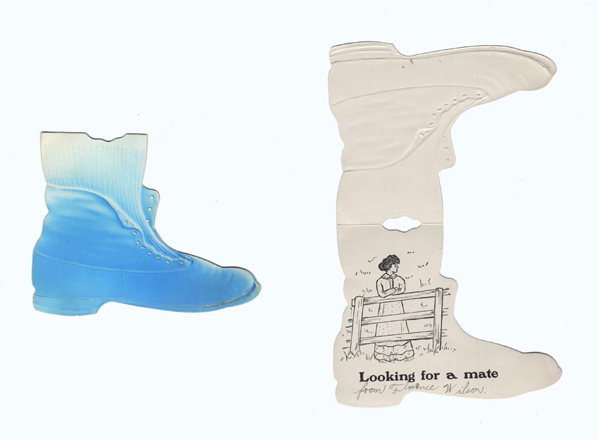 DESCRIPTION: This valentine features a single shoe. Inside is a woman looking out over a fence. Written inside is "from Florence Wilson."