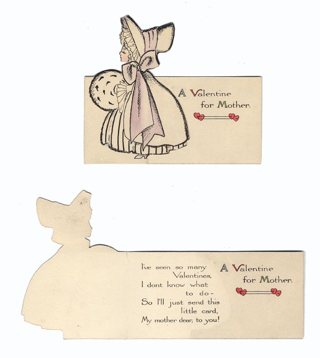 DESCRIPTION: This valentine features a woman in dress and bonnet, her hands warmed by a hand muff.