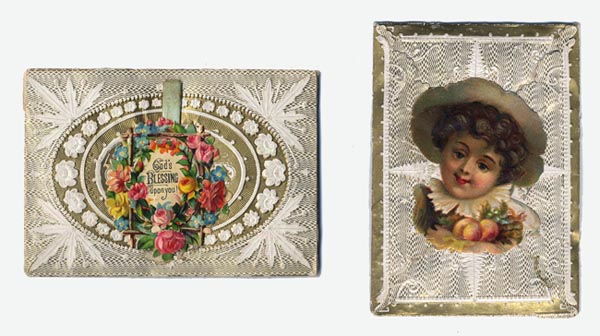 DESCRIPTION: This Valentine features a sealed scented envelope with a die-cut embossed applique of a boy holding peaches on verso and the valentine message, surrounded by flowers, on front. Pull the tab and the Valentine message folds out to reveal a stream with a tree and a small bridge in the background.