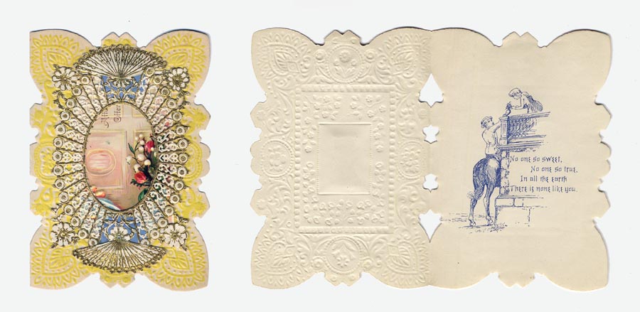 DESCRIPTION: This embossed Valentine features a piece of gilded lace - depicting two opened fans, six moderate-sized flowers, and a series of small vines and tiny flowers - which was made to stand above the yellow and white card beneath it. Inside is the love message, built into an illustration of a man on horseback offering a flower to a woman on a balcony. Written on the back is "Feb 16, 1892."