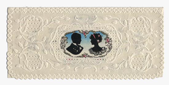 DESCRIPTION: This Valentine features a front of paper lace, a silhouetted couple printed in the center with a gilded border around them. Inside rests the love message surrounded by a floral border. Inside, written in ink "To Maurie from Katie."