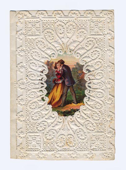 DESCRIPTION: "Wood" embossed paper valentine. This Valentine features a paper lace front with an applique of a kissing couple in the center.
