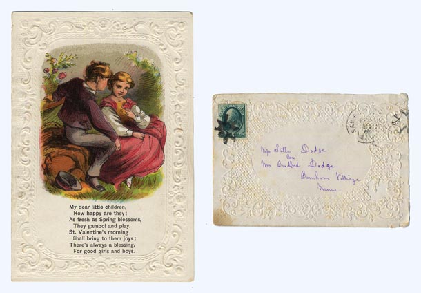 DESCRIPTION: This Valentine has an embossed decorative border around a colorful printed image.