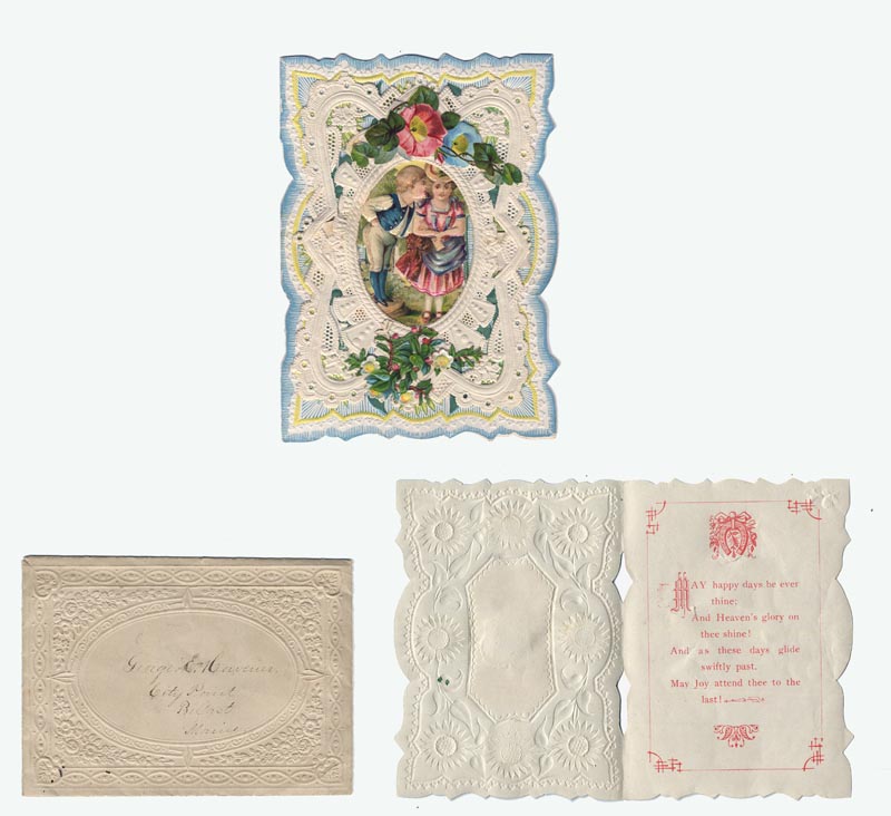 DESCRIPTION: This Valentine features paper lace upon a blue, white and yellow card. Embossed floral appliques sit upon the lace and an applique of a young couple, the boy kissing the cheek of the girl, fills the center.