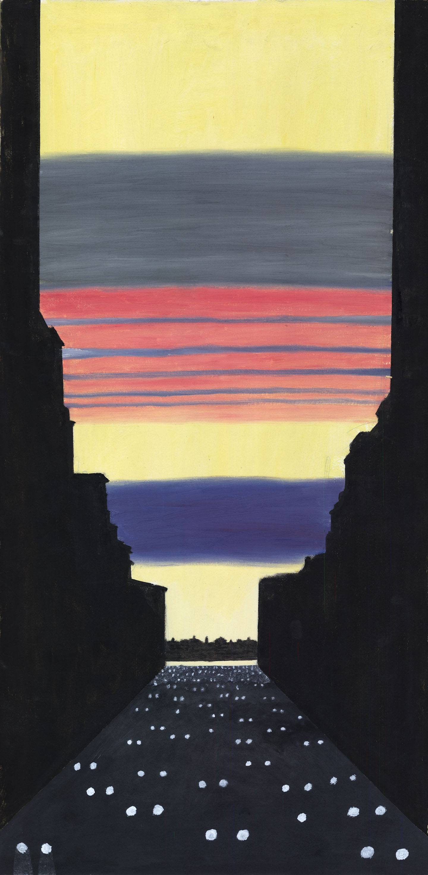 DESCRIPTION: Unsigned. - The Old Print Shop, Inc. represents the estate of Emilio Sanchez. <BR><BR> Manhattanhenge, or the Manhattan Solstice, is due to the grid system, with the Avenues aligned North and South and the streets aligned East and West. Twice a year, on the Summer Solstice and Winter Solstice, the sunset and sunrise align with the streets for a spectacular view. Emilio Sanchez captures this in a series of vertical drawings and paintings, in this case, Sunset, with the cars disappearing in the shadows, represented only by their headlights.