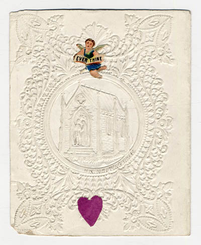 DESCRIPTION: This embossed Valentine features an elegant design with a gothic church at it's center. Written below the church is "Hix Meeting House."