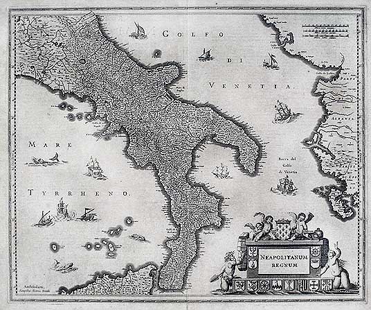 ADDITIONAL INFO: A decorative map of the "boot" of Italy surrounded by engraved images of ships and sea monsters.