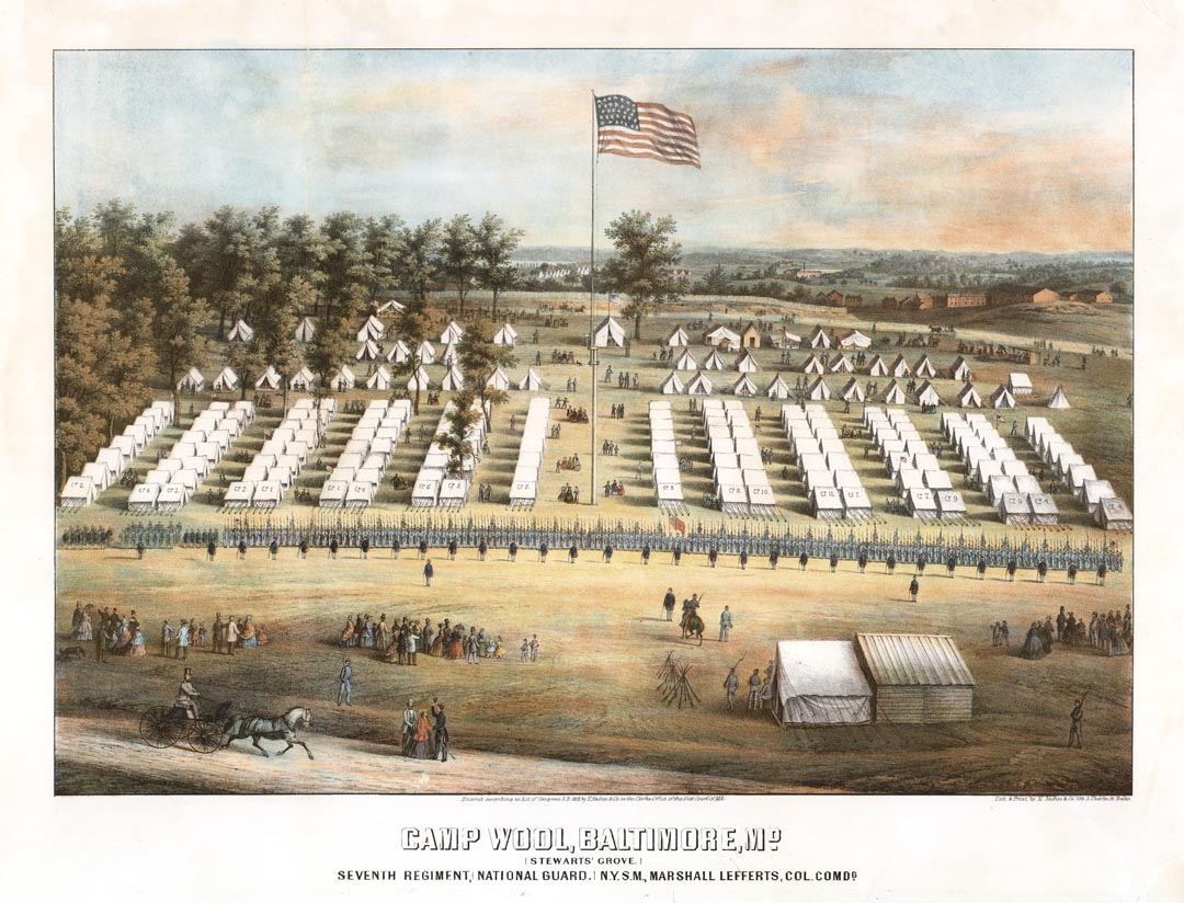 DESCRIPTION: A wonderful Civil War encampment, neat rows of tents and lines of men and officers. The Seventh Regiment is from the famous Seventh Regiment Armory at Part Avenue and 66th Street in New York City.