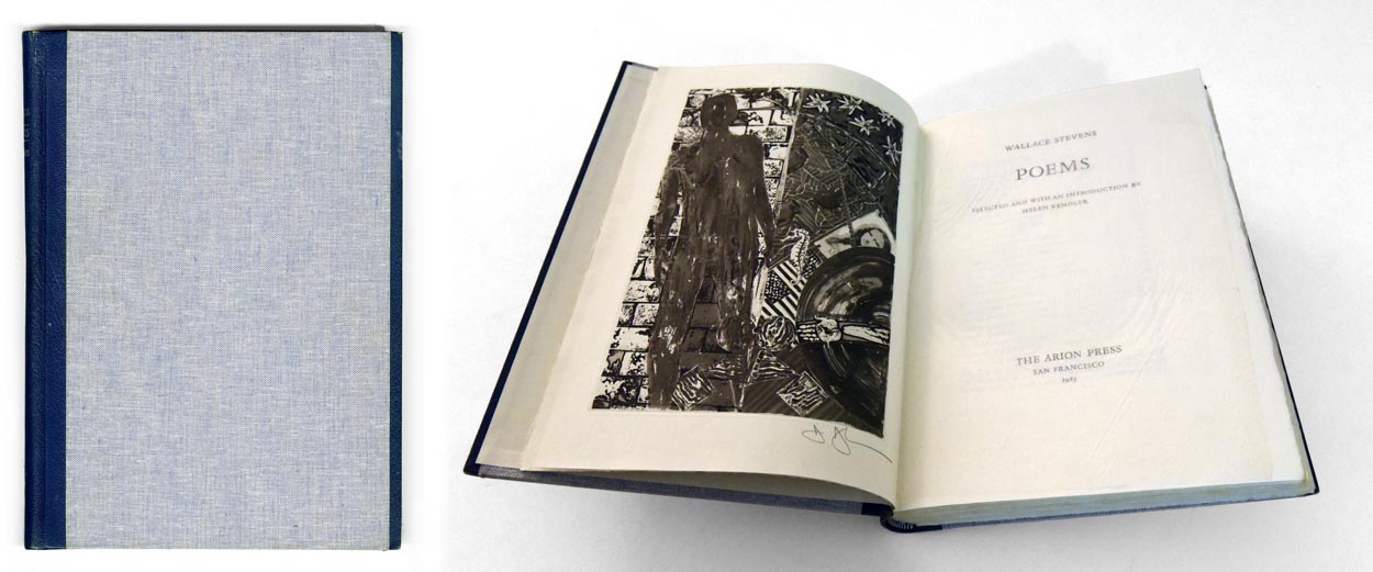 DESCRIPTION: Wallace Stevens, new selection of 122 poems; selected by Helan Vendler. Includes an original etching by Jasper Johns, signed in pencil.<BR><BR> 280 pages, printed on T. Edmonds mould-made paper. Titles and initial letters were handset by Dante Titling, text in Monotype Bembo by Mackenzie-Harris Corp. The Jasper John etching was printed by Universal Limited Art Editions. The edition limited to 326 copies, of which 300 are for sale and letters A-Z are reserved for collabators. Quarto (4to) (12 x 8 1/2"). Binding in blue goatskin spine and foreedge, with blue grey linen boards, lettering on spine in silver. Announcement for the publication of the book and an invoice to the previous owner laid-in. <br><br> Wallace Stevens (1879-1955) was a modernist, an inventor of twentieth-century literature. Helen Vendler says "He created a new style for a new age. . ." His poetry of facets, reflections from the revolving crystal of the world, of multiple realities and truths, was a courageous experiment with language.