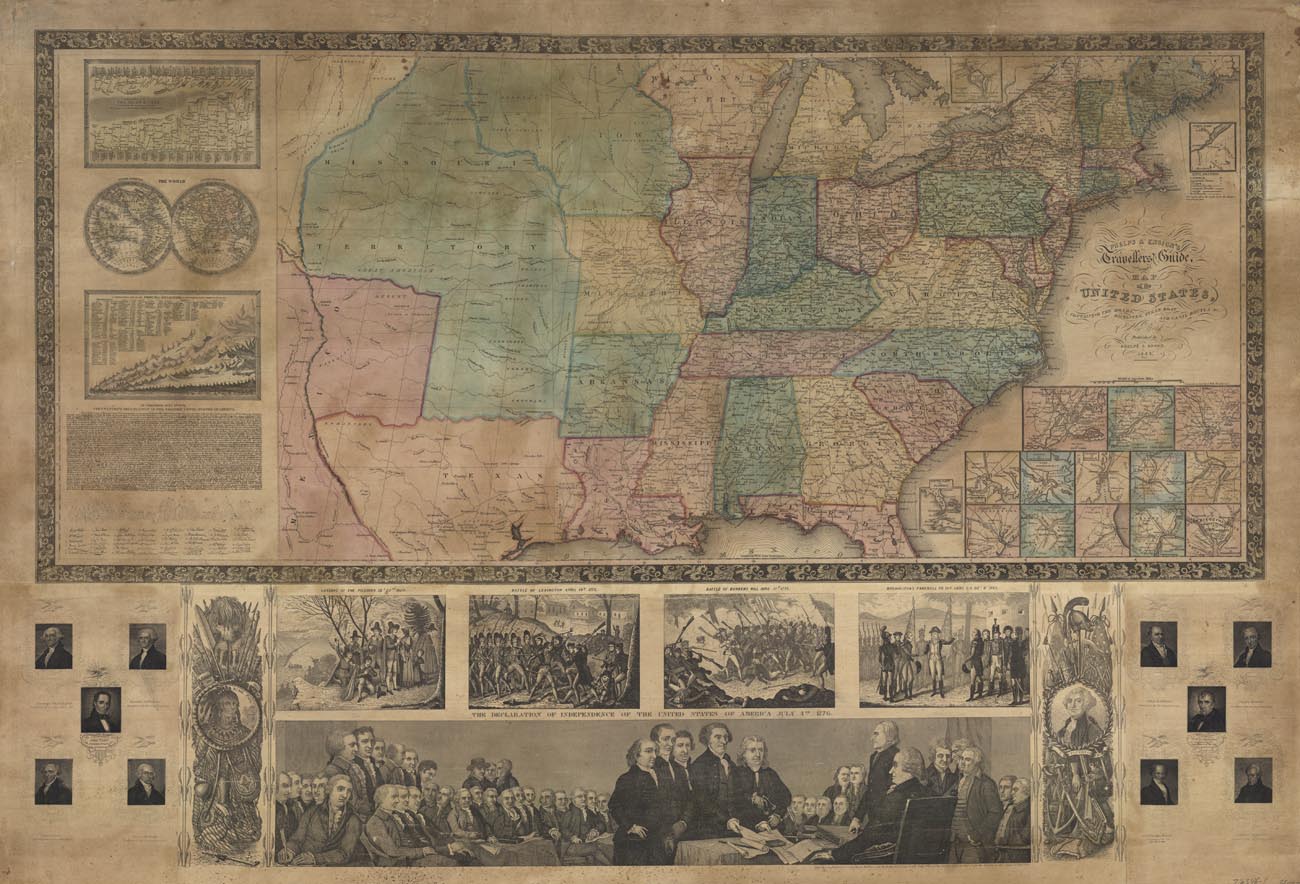 DESCRIPTION: A highly decorative linen backed wall map of the United States. Printed on four separate sheets. The map, center historical images, and portraits on the left and right below the map are each separate sheets. The map and center historical images are stone engravings, the portraits left and right below the map are copper engravings. <BR><BR> The map is full of historical images including portraits of the first ten presidents, landing of the Pilgrims, Battle of Lexington, Battle of Bunker's Hill and Washington's farewell to the Army. Below that is a large image of the Declaration of Independence based on Trumbull's painting. To the left of the map are insets showing: The chief rivers of the world, A double hemisphere map of the world, Principal mountains of the world, The text of the Declaration of Independence and a key giving the names of the signers of the Declaration of Independence. Cartographically the maps shows an evolving United States west of the Mississippi. A large Missouri territory, large Iowa territory, a truncated Texas and Wisconsin territory.