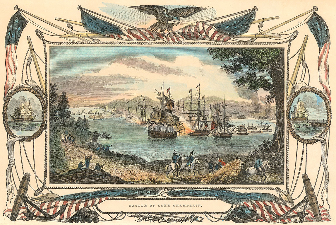 DESCRIPTION: This small view, featured in the 1846 edition of J. Fenimore Cooper's History of the Navy of the United States of America, depicts the pivotal Battle of Lake Champlain, also known as the Battle of Plattsburgh, which took place on September 11, 1814, during the War of 1812. The battle was a decisive American victory, where Commodore Thomas Macdonough led a fleet that successfully repelled the British naval forces, thwarting their invasion plans and securing control of the lake. This victory played a crucial role in the subsequent peace negotiations, solidifying American sovereignty and contributing to the eventual end of the war. The inclusion of this view in Cooper's history underscores the battle's significance in shaping the early naval legacy of the United States.