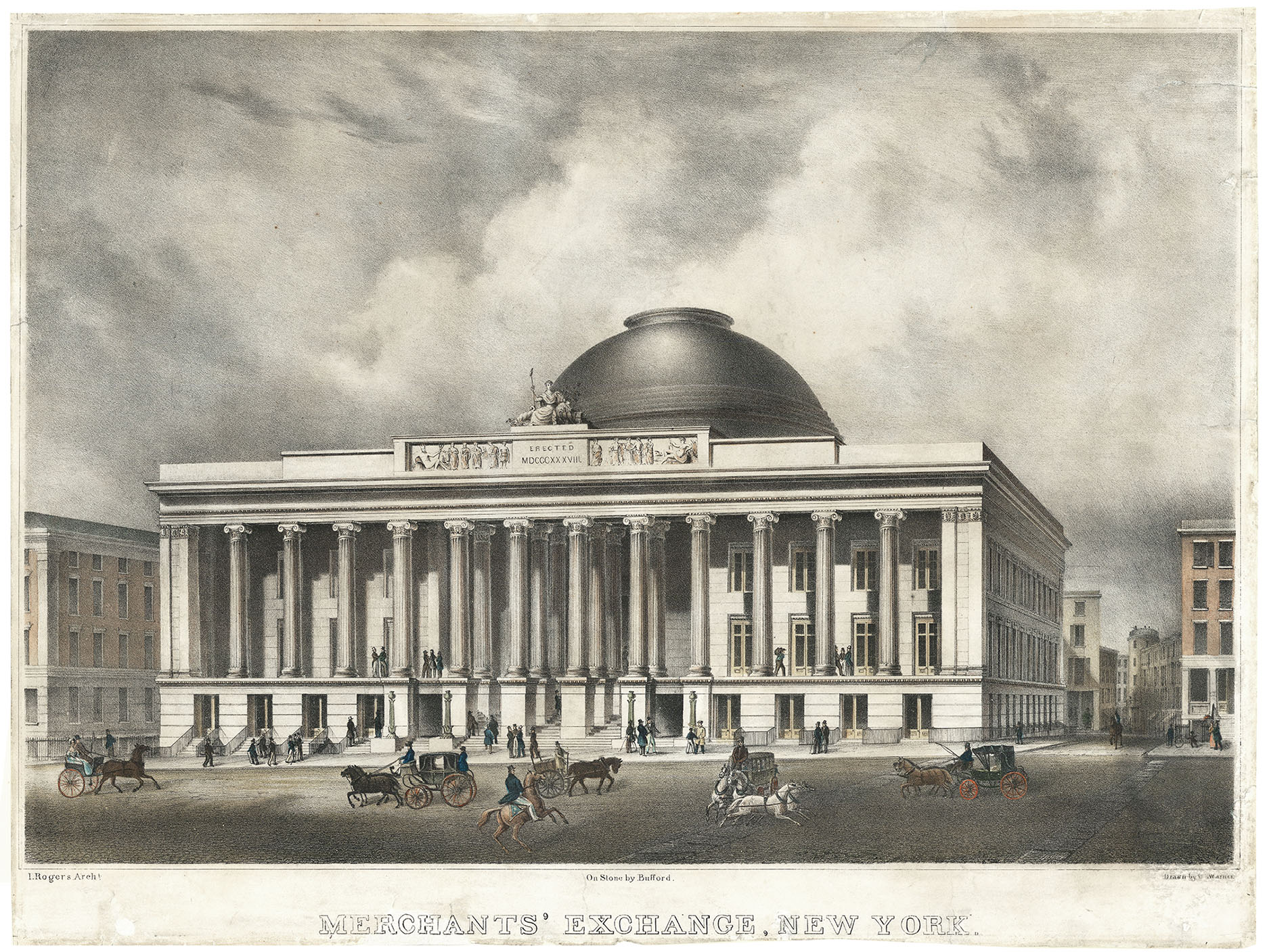 DESCRIPTION: I. Rogers Archt. On stone by Bufford. Drawn by B. Warner. The building was built between 1836 and 1842 in a Greek revival style and stands at 55 Wall Street. It was remodeled in 1899 by McKim, Mead & White for the headquarters of National City Bank (now known as Citibank) adding four stories to the building. In 1998 it was converted into a condominium and renamed The Regent Wall Street. <br><br> A very rare lithograph of a still standing New York City building.