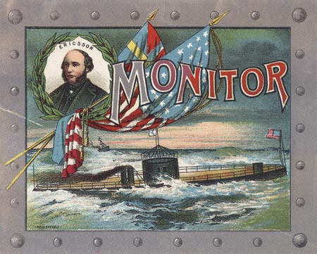 DESCRIPTION: Sitting in the flags is a portrait of Ericsson in a round of laurel leaves. This lively print is bordered with a printed metallic silver that looks like grommets.