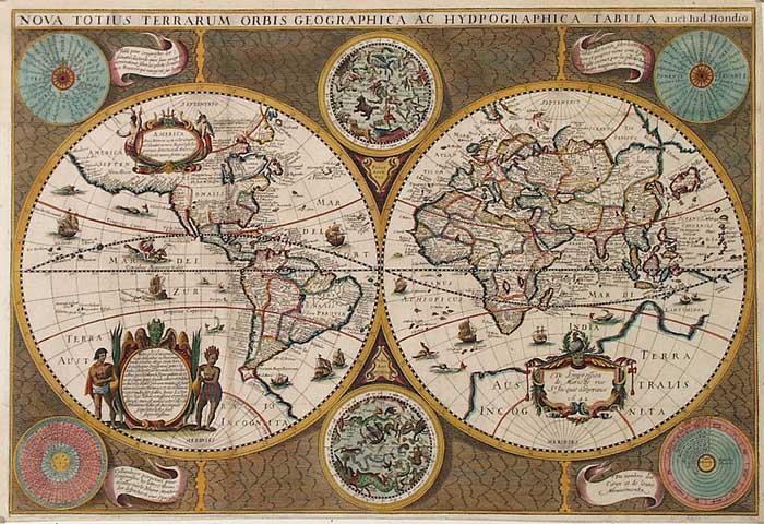 DESCRIPTION: This is a good example of this scarce world map. This map was issued by Mariette and was based on Joducus Hondius' more common world map of 1617. In the early 17th century, several maps based on Hondius' map were printed by different cartographers such as Berey, and Boisseau. Engraved images of compasses, celestial spheres, sailing ships, sea monsters and Neptune himself help to make this a highly decorative map. First state of two.