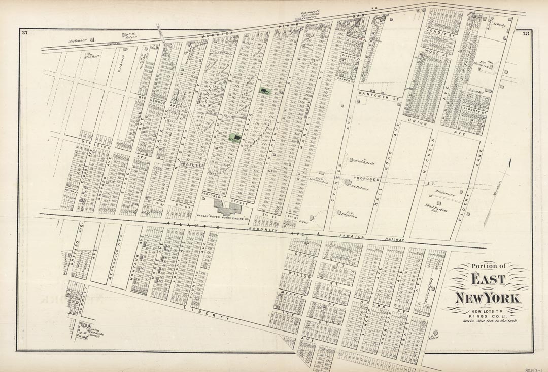 DESCRIPTION: A detailed map from "Atlas of Long Island, New York. From recent and actual surveys and records." It depicts a section of East New York from Jamaica Plane Road to Liberty Avenue and Shepard Avenue to Eldert Lane. After the Williamsburgh Bridge opened in 1903 and a subway line to New Lots was completed it grew rapidly and became home to many Eastern European immigrants. The conduit and building for Nassau Water Works Engine can be seen to the left of map center.