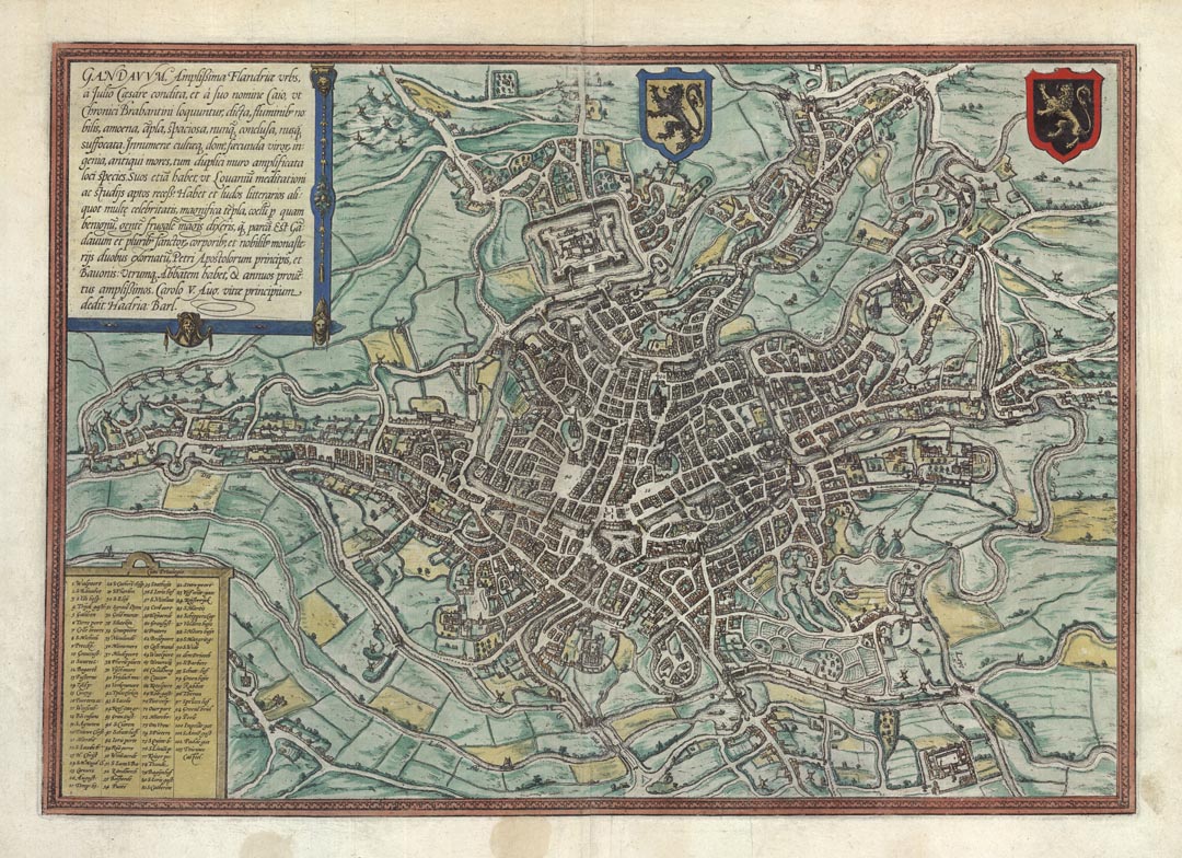 DESCRIPTION: A fine view of the city of Ghent from Braun & Hogenberg’s “Civitates Orbis Terrarum." The following is a translation of the text on front of map: "Ghent, the most splendid city in Flanders, was founded by Julius Caesar and called Gaius after his forename, as the Brabant chroniclers relate. The city is distinguished by its rivers, altogether delightful, magnificent, spacious, never confined, nowhere stifling."