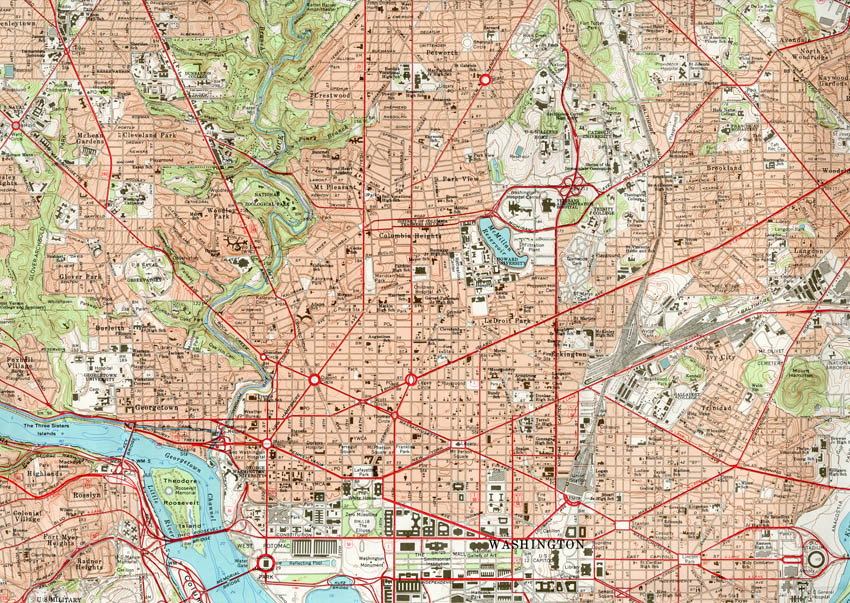 DESCRIPTION: Detailed map spreading from Merrifield, Virginia on the west edge to Largo, Maryland on the east, and Kensington, Maryland on the north to Huntington, Virginia and Pagett's Corner, Maryland on the south. Topography, roads, parks, landmarks and notable buildings are shown. Pictured is a detail of Washington, D.C. in the center.