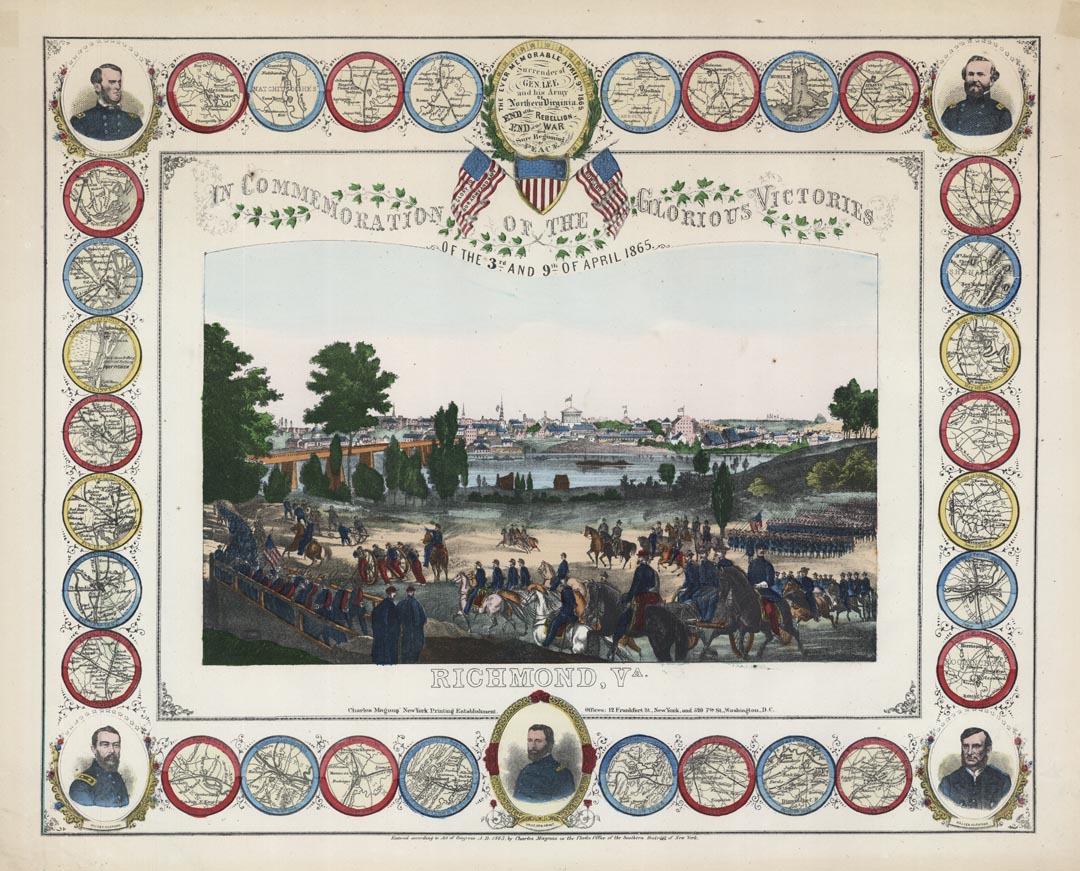 DESCRIPTION: A fine view of the city of Richmond depicted at the end of the Civil War. The Capitol Building is shown prominently. A series of five portraits of northern generals (Grant, Sheridan, Sherman, Thomas, and Kilpatrick) and thirty circular battle maps surround the main image. The battles mapped are Dallas, Ga.; Kannasaw, Ga.; Mobile, Al.; Atlanta, Ga.; Yellow Tavern, Va.; New Market, Va.; Drury's Bluff, Va.; Spotsylvania, Va.; Cold Harbor, Va.; Petersburg, Va.; Mt. Crawford, Va.; Burnsville Junction, Va.; Five Forks, Va.; Battle of Fort Stedman; Staunton, Va.; Cedar Creek, Va.; Monacacy, Md.; Lynchburg, Va.; White House, Va.; Goldsboro, N.C.; Wilmington, N.C.; Charleston, S.C.; Columbia, S.C.; Fort Fisher, N.C.; Savannah, Ga.; Ft. McAlister, Ga., Ft. DuRussey, La.; Cane River, La.; Dalton, Ga.; and Rasaca, Ga.