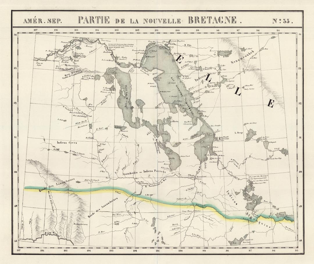 DESCRIPTION: A beautiful map of south central Canada focusing on current day Manitoba Province and northern portion of North Dakota and Northwestern Minnesota. Fort Garry (current day Winnipeg) is noted at the confluence of the Red and Assiniboine Rivers. Lakes Winnipeg and Manitoba are also prominently shown. The yellow and green line shows the not yet set and meandering border between the United States and Canada. Plate No. 33 from "Atlas Universelleā The first commercial atlas printed using lithography as the printing medium.