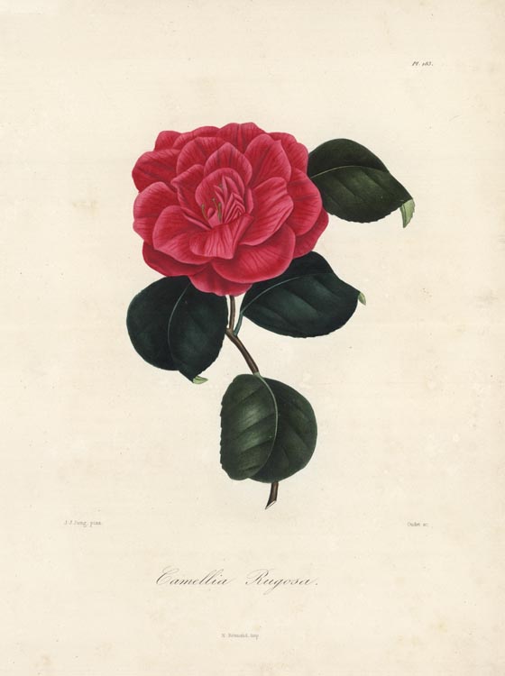 DESCRIPTION: From "Iconographie du Genre Camellia ou Description et Figures des Camellia les Plus Beaux et les plus rares" printed by Adde Laurent Berlese in Paris.